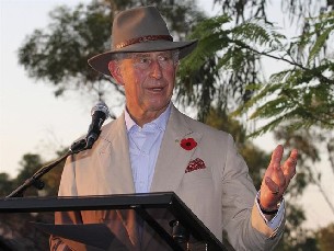 Debido a las altas temperaturas del verano austral, más de cuarenta grados, el Príncipe Carlos de Inglaterra escogió un traje de chaqueta de lino en color beige y camisa azul clara que combinó con un sombrero de ala ancha al más puro estilo 'Cocodrilo Dundee'.
