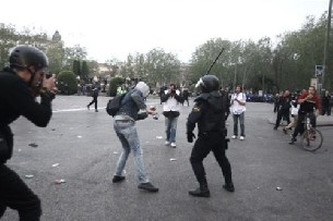 En ese momento, antidisturbios que estaban desplegados en uno de los extremos de la plaza acudieron rápidamente al lugar, estableciendo un perímetro de seguridad entre los manifestantes y el vallado que apenas duró unos segundos, ya que acto seguido procedieron a la primera carga que desembocó en el 'correcalles' desde Neptuno.