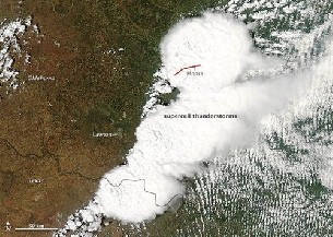 El espectrorradiómetro de imágenes de resolución moderada (MODIS, por sus siglas en inglés), en el satélite Aqua, de la NASA, captó una imagen de la tormenta, a las 14:40 horas (hora local). Esta tormenta terminaría convirtiéndose en el fenómeno meteorológico que ha terminado con la vida de más de medio centenar de personas.