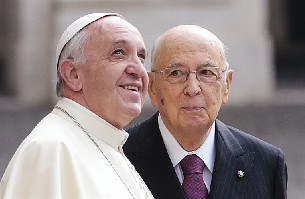 El Papa Francisco ha realizado este jueves una visita oficial al presidente de la República Italiana, Giorgio Napolitano, en el Palacio del Quirinale para devolver la visita que Napolitano le hizo en el Vaticano el pasado 8 de junio. Ambos líderes se saludaron por primera vez el 19 de marzo de 2013 al finalizar la Misa de Inicio de Pontificado del Papa Francisco, por lo que este es su tercer encuentro.