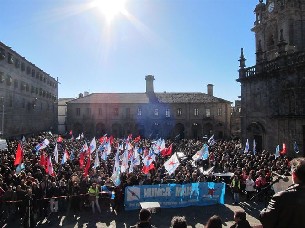 "Aquí estamos de nuevo, reclamando justicia, recordando lo que aún queda por hacer y exigiendo soluciones concretas", ha proclamado en la Praza da Quintana, ante unas 5.000 personas, el escritor Suso de Toro, que se ha encargado de la lectura del escrito en la capital gallega, al igual que Manuel Rivas al término de otra multitudinaria manifestación en Ferrol, que confluyó con la de trabajadores del naval.