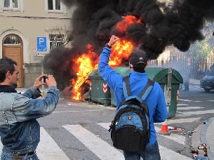 En este céntrico punto de la capital gallega se reagruparon pasadas las 16,00 horas después de dispersarse dejando atrás tres barricadas de contenedores ardiendo y daños aislados en un vehículo estacionado en la vía y algo de material urbano.