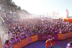 a la marea multicolor, salpicada por 10.000 kilos de polvos azules, rosas,