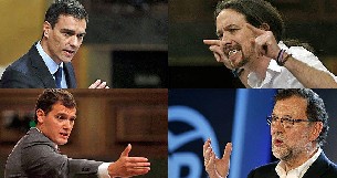 Los candidatos del PP, Mariano Rajoy, PSOE, Pedro Sánchez, Unidos Podemos, Pablo Iglesias, y Ciudadanos, Albert Rivera, acuden hoy al debate en televisión con tranquilidad y con ganas de exponer sus propuestas de cara a las elecciones del 26 de junio, en el que será el único duelo a cuatro de la campaña.
