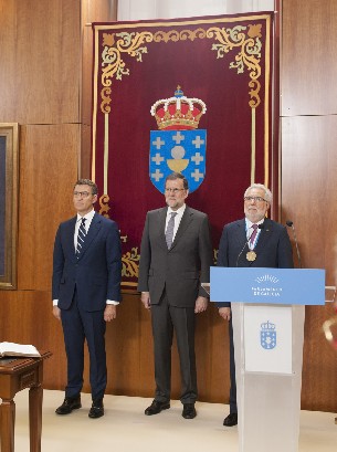 Núñez Feijóo ha tomado hoy posesión por tercera vez del cargo de presidente de la Xunta con un acto más institucional primero, en el Parlamento gallego, donde también participó el presidente del Gobierno, Mariano Rajoy, y otro más popular después, marcado por la lluvia, en la plaza del Obradoiro. Efe