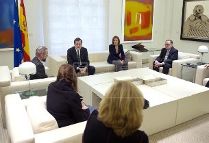 Rajoy, junto a la ministra de Defensa, María Dolores de Cospedal, ha recibido en el Palacio de la Moncloa a los representantes de la asociación de familiares de los 62 militares fallecidos en 2003 en el accidente del Yak-42 en Turquía. EFE