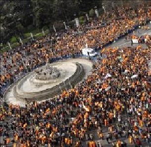 El PP ha reunido a cientos de miles de personas en Madrid en protesta por la política penitenciaria del Gobierno y la concesión del segundo grado al etarra De Juana Chaos. Bajo el lema "España por la libertad, no más cesiones a ETA", los asistentes, que la Comunidad de Madrid cifra en más de dos millones y la Delegación del Gobierno en más de 300.000, marcharon sin incidentes entre la plaza de la Cibeles y la de Colón. El líder del PP, Mariano Rajoy, portó la pancarta con el lema principal de la convocatoria. Junto a él se situó la presidenta del PP vasco, María San Gil, y Pilar Elías, la viuda de Ramón Baglietto, así como de numerosos cargos electos del partido en el País Vasco. También estaba presente el ex presidente del Gobierno José María Aznar, que fue muy aplaudido a su llegada a la Plaza de Cibeles junto con su esposa, Ana Botella, y junto a Pilar Elías el padre de Miguel Ángel Blanco, el concejal del PP de Ermua asesinado por ETA en 1996. También destacó la presencia de la presidenta de la Comunidad de Madrid, Esperanza Aguirre; la de los portavoces del PP en las Cámaras, Eduardo Zaplana y Pío García Escudero, o la del alcalde de Madrid, Alberto Ruiz Gallardón, entre otros, así como la del ex jefe del Ejecutivo Leopoldo Calvo Sotelo. Ya por detrás, se situaron los barones territoriales y los alcaldes de las capitales de provincia, diputados, senadores y parlamentarios de todas las Cámaras. El encargado de cerrar la movilización fue Rajoy, que convocó "solemnemente" a los ciudadanos a "defender la nación española" frente a la "claudicación" ante ETA por parte del Gobierno y a "recuperar la España que no se rendía ante los terroristas" ni les pagaba "peaje" para buscar con ellos un "trato delirante". Rajoy exigió al Gobierno que rectifique y deje de buscar con ETA una "paz engañosa". El líder del PP, acompañado por concejales amenazados de su partido, agradeció la participación en la manifestación, convocada por "la torpeza de un Gobierno que se ha dejado coaccionar por un asesino y ha cedido", e instó al Ejecutivo a que rectifique y a que se imponga la razón. Su intervención, que duró unos 20 minutos, fue interrumpida en numerosas ocasiones por los aplausos y gritos de los manifestantes, que además corearon al terminar el discurso los "Viva la libertad" y "Viva España" que proclamó Rajoy desde el escenario. El acto terminó con el himno nacional y un aplauso. Entre los gritos que interrumpieron a Rajoy en varias ocasiones se pudo escuchar "Zapatero dimisión", el más repetido, o "España, España", "Todos a una contra Batasuna" y "España unida jamás será vencida".