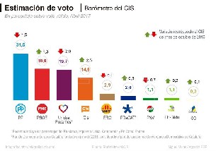 El PP ha perdido un punto y medio en estimación de voto hasta el 31,5 por ciento según el último barómetro del CIS, que refleja una subida de 1,3 puntos para el PSOE -19,9- que recupera la segunda plaza ante la bajada de 2 puntos de Unidos Podemos y sus confluencias, que se quedan con el 19,7.