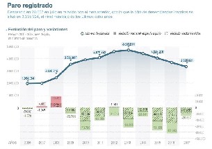 El número de personas en paro registradas en las oficinas del Servicio Público de Empleo Estatal (SEPE) descendió en 26.887 en julio en relación con el mes anterior, con lo que la cifra de desempleados inscritos se situó en 3.335.924, el nivel más bajo de los últimos ocho años.