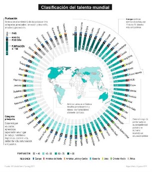 A nivel mundial España se sitúa en el ránking de Talento Mundial 2017 publicado hoy por el Centro de Competitividad Mundial (CCM) de la escuela de negocios suiza IMD en el puesto 32 de un total 63, con lo que ha mejorado dos puestos. EFE