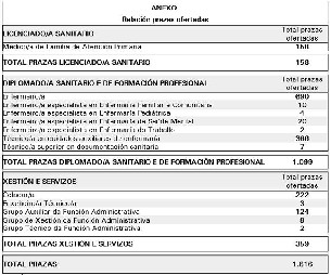 O Servizo Galego de Saúde convocará un total de 1.616 prazas na súa oferta pública de emprego de persoal estatutario deste ano. Esta oferta de emprego, a maior dende hai cinco anos do departamento que dirixe Jesús Vázquez Almuiña, duplica a oferta de emprego do Sergas do pasado ano. Así o anunciou, en rolda de prensa, a directora xeral de Recursos Humanos do departamento sanitario autonómico, Margarita Prado Vaamonde. Nesta convocatoria, se duplican as prazas de médico de familia e se introduce a especialidade de enfermería familiar e comunitaria e a enfermería pediátrica.